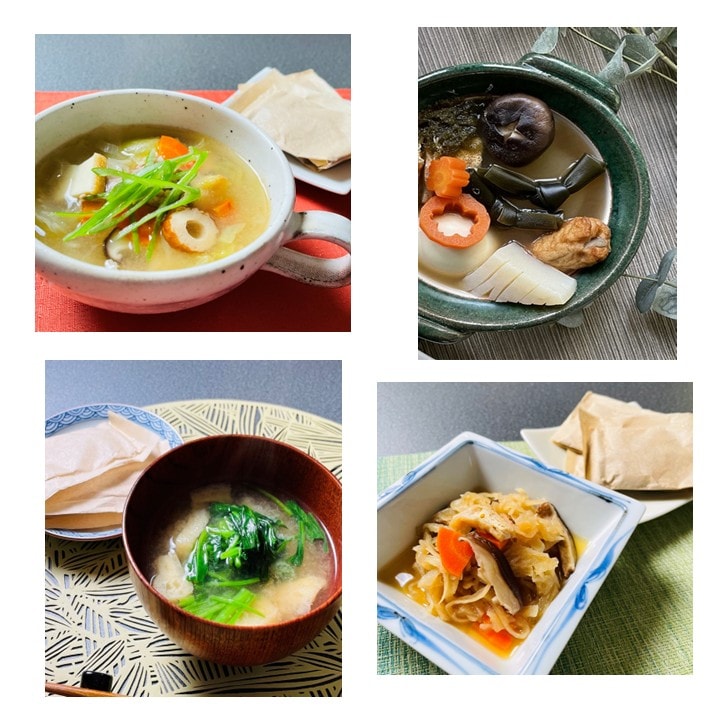 味だしパックを取り出して各種お料理にお使いください。
